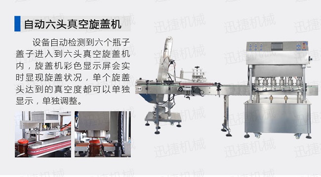自動供瓶機+全自動滾筒洗瓶機+自動六米烘干機+自動收瓶機+全自動六頭灌裝機自動灌裝+全自動提蓋機自動理蓋、提蓋、掛蓋+六頭真空旋蓋機同時六個頭真空旋蓋+套標機+收縮機+圓瓶貼標機+整理平臺;