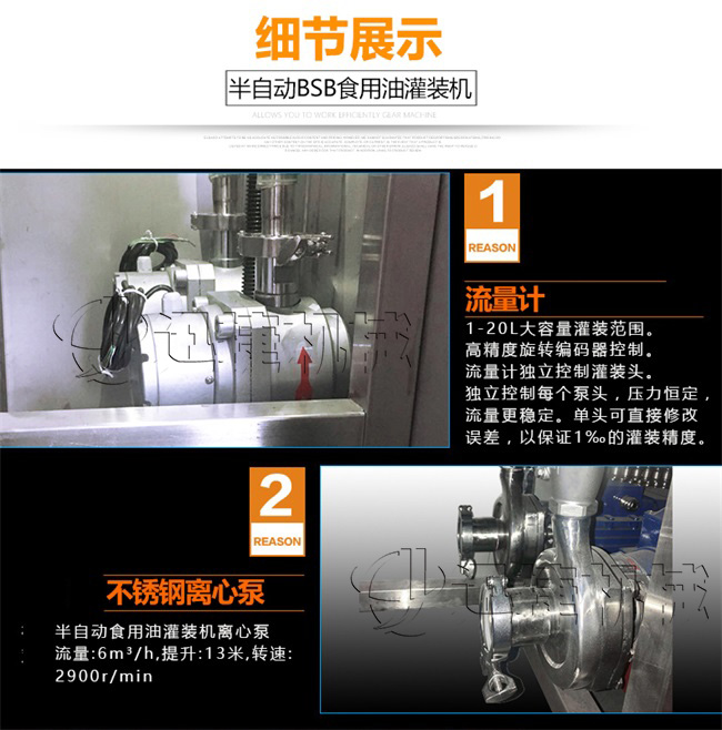 本機適用于花生油、大豆油、菜籽油、色拉油、芝麻油、石油化工潤滑油等各種油類和粘稠液體的定量要求。半自動雙頭電動BSB食用油灌裝機:采用的微電腦技術,自備動力,管路無需加壓,節約運行成本;自動檢測油浙、自動修正溫度變化引起的密度變化,適合大溫差環境的油品灌裝工作,使用方便靈活;機電一體化設計,安裝方便,整機價格低廉。