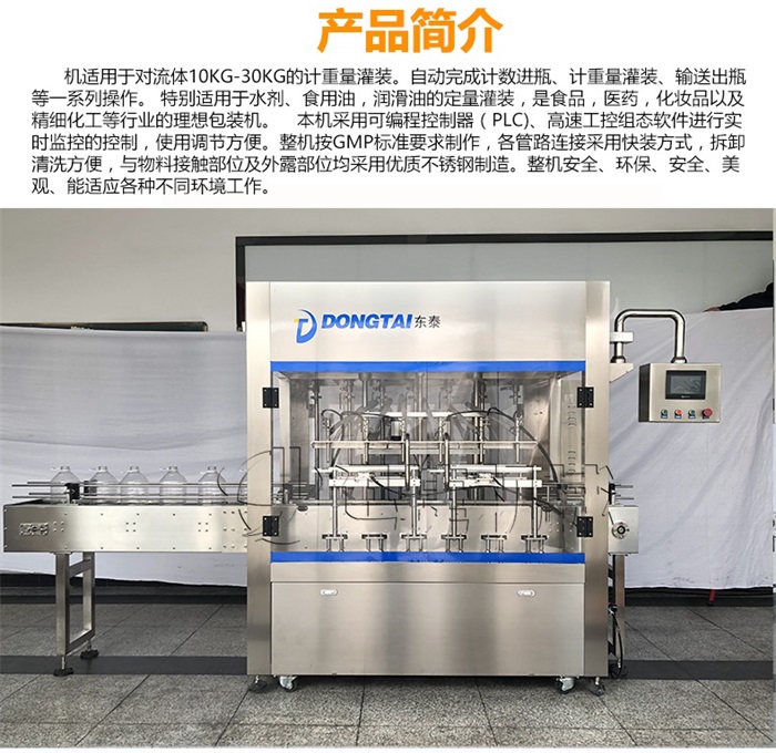 機(jī)適用于對流體5kg-30kg的計重量灌裝。自動完成計數(shù)進(jìn)瓶、計重量灌裝、輸送出瓶等一系列操作。 特別適用于水劑、食用油,潤滑油的定量灌裝,是食品,醫(yī)藥,化妝品以及精細(xì)化工等行業(yè)的包裝機(jī)。本機(jī)采用可編程控制器(PLC)、高速工控組態(tài)軟件進(jìn)行實(shí)時監(jiān)控的控制,使用調(diào)節(jié)方便。整機(jī)按GMP標(biāo)準(zhǔn)要求制作,各管路連接采用快裝方式,拆卸清洗方便,與物料接觸部位及外露部位均采用優(yōu)質(zhì)不銹鋼制造。整機(jī)安全、環(huán)保、安全、美觀、能適應(yīng)各種不同環(huán)境工作。