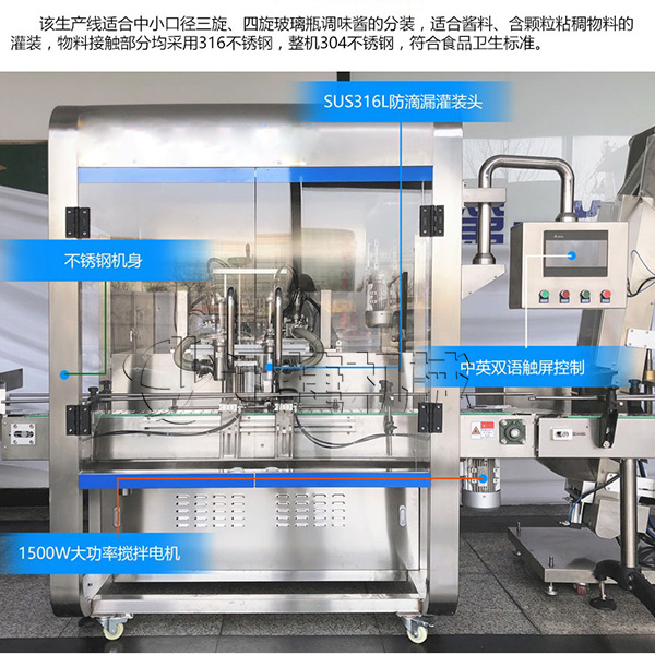 如今在濃醬類灌裝市場里,濃醬的種類越來越多,自動濃醬罐裝機因為醬料的濃稠性,自動濃醬灌裝機的灌裝起來會有很多問題,比如油醬的分離是大家一直考慮的問題,大家都知道,油醬分離首先就是油醬不均勻,在超市里我們買醬時候有時候會碰到這種問題,有的油多有的醬多,我們自然不會去挑選這種,再者油醬分離還會影響口感,那我們迅捷機械根據油醬分離的這種問題做出了調整。