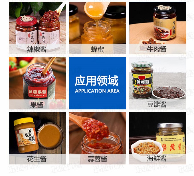 醬料灌裝機采用活塞式灌裝原理,適用于調味品中帶顆粒并且濃度較大的辣椒醬、豆瓣醬、花生醬、香菇醬、果醬、牛油火鍋底料、紅油火鍋底料、蝦醬等較為粘稠醬類的灌裝。
